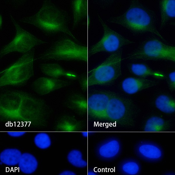 The cells were fixed with 4% PFA (10min, RT) followed by treatment with 0.1% Triton X-100 (10min, RT), and blocked in 1% BSA/10% normal goat serum/0.3M glycine in 0.1% PBS-Tween 20 for 1h. The cells were then incubate with db12377 (1:50) at room temprature for 1h, followed by a further incubation at room temperature for 45min with Goat Anti Rabbit lgG (H+L)-AF488 (