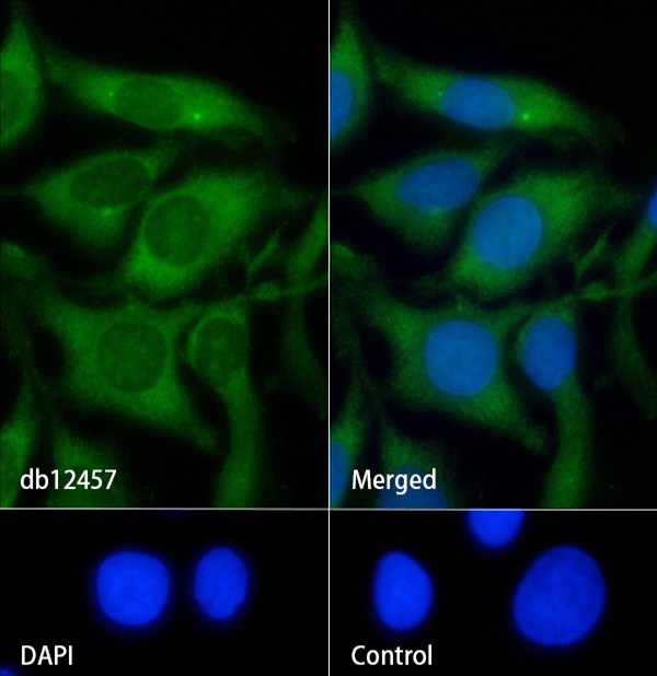 The cells were fixed with cold 100% methanol (10min, 4℃) and blocked in 1% BSA/10% normal goat serum/0.3M glycine in 0.1% PBS-Tween 20 for 1h. The cells were then incubate with db12457 (1:100) at room temprature for 1h, followed by a further incubation at room temperature for 45min with Goat Anti Rabbit lgG (H+L)-AF488 (