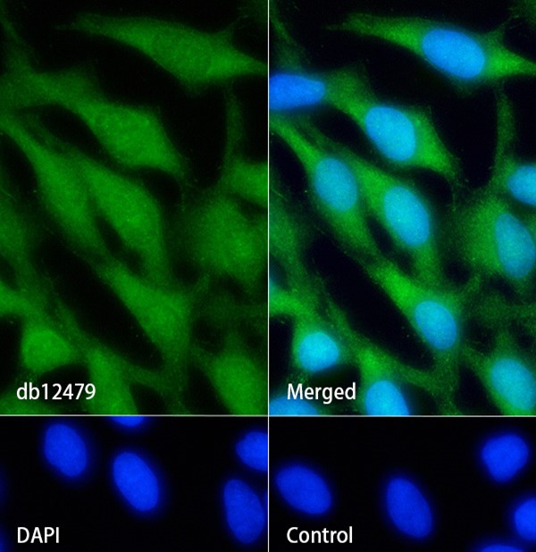 The cells were fixed with cold 100% methanol (10min, 4℃) and blocked in 1% BSA/10% normal goat serum/0.3M glycine in 0.1% PBS-Tween 20 for 1h. The cells were then incubate with db12479 (1:200) at room temprature for 1h, followed by a further incubation at room temperature for 45min with Goat Anti Rabbit lgG (H+L)-AF488 (