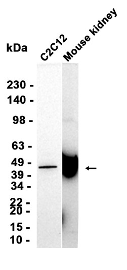 Western blot analysis of extracts from C2C12 cells and Mouse kidney tissue using db12498 at 1:3000.