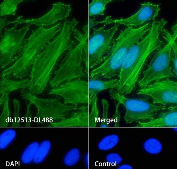 The cells were fixed with 4% PFA (10min, RT) followed by treatment with 0.1% Triton X-100 (10min, RT), and blocked in 1% BSA/10% normal goat serum/0.3M glycine in 0.1% PBS-Tween 20 for 1h. The cells were then incubate with db12513-DL488 (1:200, shown in green). Nuclear DNA was labeled in blue with DAPI.