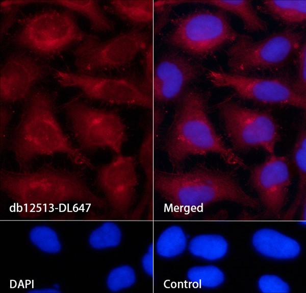 The cells were fixed with cold 100% methanol (10min, 4℃) and blocked in 1% BSA/10% normal goat serum/0.3M glycine in 0.1% PBS-Tween 20 for 1h. The cells were then incubate with db12513-DL647 (1:200,shown in red) at room temprature for 1h. Nuclear DNA was labeled in blue with DAPI.