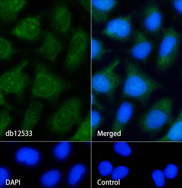 The cells were fixed with cold 100% methanol (10min, 4℃) and blocked in 1% BSA/10% normal goat serum/0.3M glycine in 0.1% PBS-Tween 20 for 1h. The cells were then incubate with db12533 (1:20) at room temprature for 1h, followed by a further incubation at room temperature for 45min with Goat Anti Rabbit lgG (H+L)-AF488 (