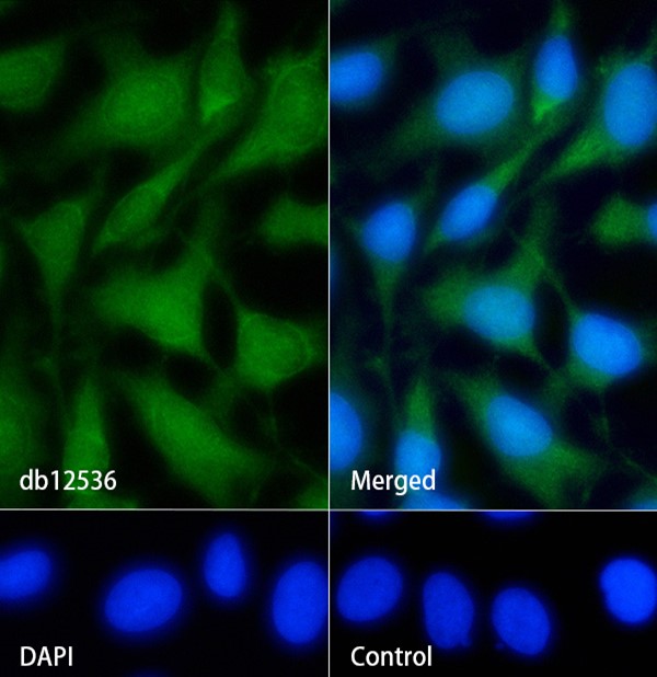 The cells were fixed with cold 100% methanol (10min, 4℃) and blocked in 1% BSA/10% normal goat serum/0.3M glycine in 0.1% PBS-Tween 20 for 1h. The cells were then incubate with db12536 (1:200) at room temprature for 1h, followed by a further incubation at room temperature for 45min with Goat Anti Rabbit lgG (H+L)-AF488 (
