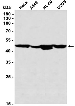 Western blot analysis of extracts from HeLa, A549, HL-60, U-2 OS cells using db12902 at 1:1000.