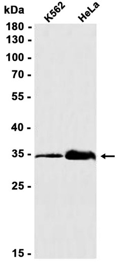 Western blot analysis of extracts from K562, HeLa cells using db12988 at 1:1000.