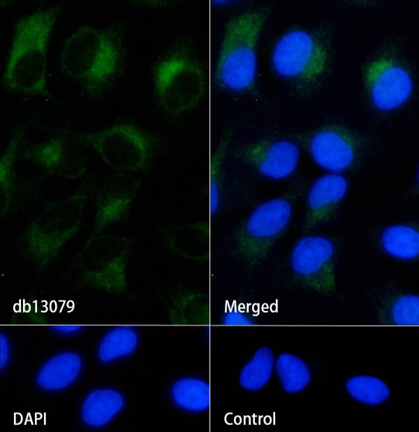 The cells were fixed with cold 100% methanol (10min, 4℃) and blocked in 1% BSA/10% normal goat serum/0.3M glycine in 0.1% PBS-Tween 20 for 1h. The cells were then incubate with db13079 (1:50) at room temprature for 1h, followed by a further incubation at room temperature for 45min with Goat Anti Rabbit lgG (H+L)-AF488 (