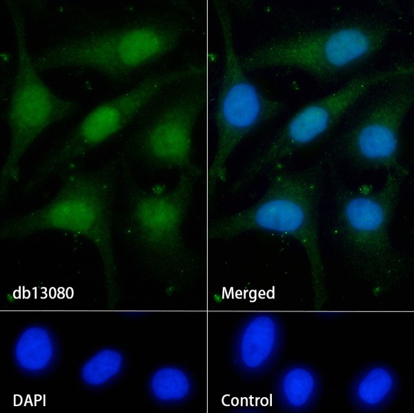 The cells were fixed with 4% PFA (10min, RT) followed by treatment with 0.1% Triton X-100 (10min, RT), and blocked in 1% BSA/10% normal goat serum/0.3M glycine in 0.1% PBS-Tween 20 for 1h. The cells were then incubate with db13080 (1:200) at room temprature for 1h, followed by a further incubation at room temperature for 45min with Goat Anti Rabbit lgG (H+L)-AF488 (