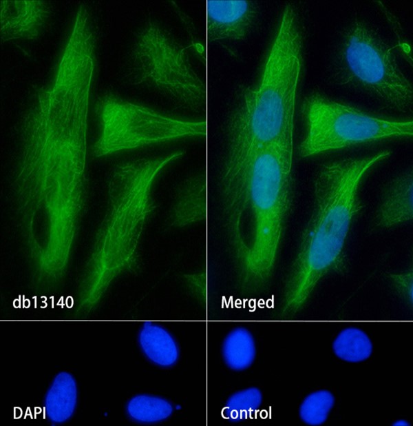 The cells were fixed with cold 100% methanol (10min, 4℃) and blocked in 1% BSA/10% normal goat serum/0.3M glycine in 0.1% PBS-Tween 20 for 1h. The cells were then incubate with db13140 (1:100) at room temprature for 1h, followed by a further incubation at room temperature for 45min with Goat Anti Rabbit lgG (H+L)-AF488 (