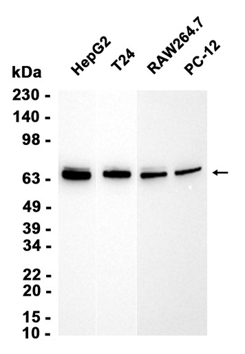 Western blot analysis of extracts from HepG2, T24, RAW264.7, PC-12 cells using db13160 at 1:5000.