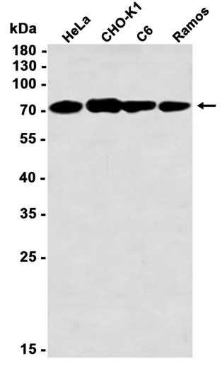 Western blot analysis of extracts from HeLa, CHO-K1, C6, Ramos cells using db13160 at 1:1000.
