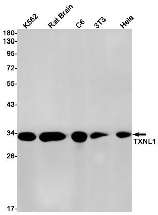Western blot detection of TXNL1 in K562,Rat Brain,C6,3T3,Hela cell lysates using TXNL1 antibody(1:1000 diluted).