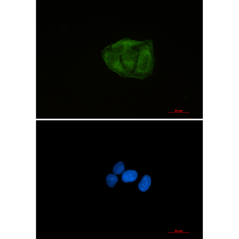Immunofluorescent analysis of HeLa cells using db13183 antibody (green), and DAPI (blue).
