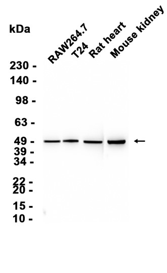 Western blot analysis of extracts from RAW264.7,T24 cells and Mouse kidney,Rat heart tissue using db13194 at 1:1000.