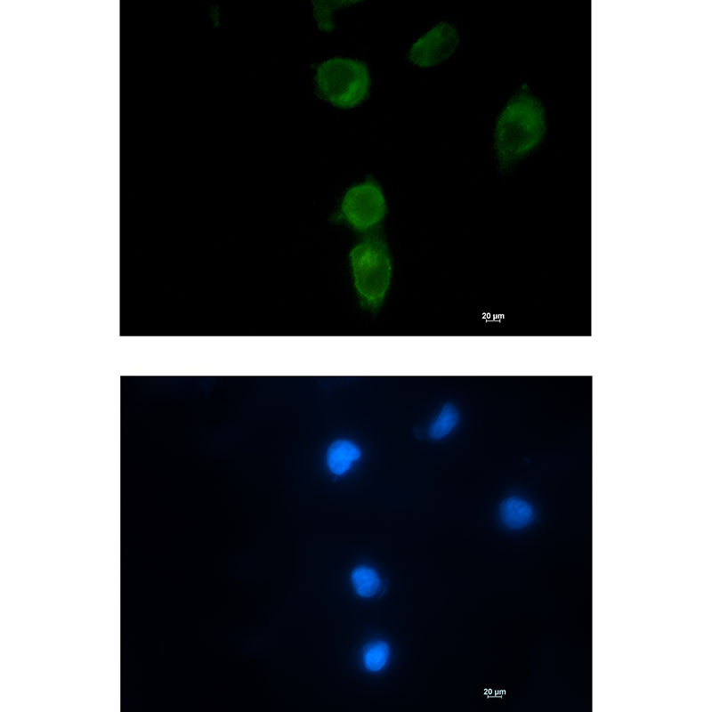 Immunofluorescent analysis of HT-1080 cells using db13197 antibody (green), and DAPI (blue).