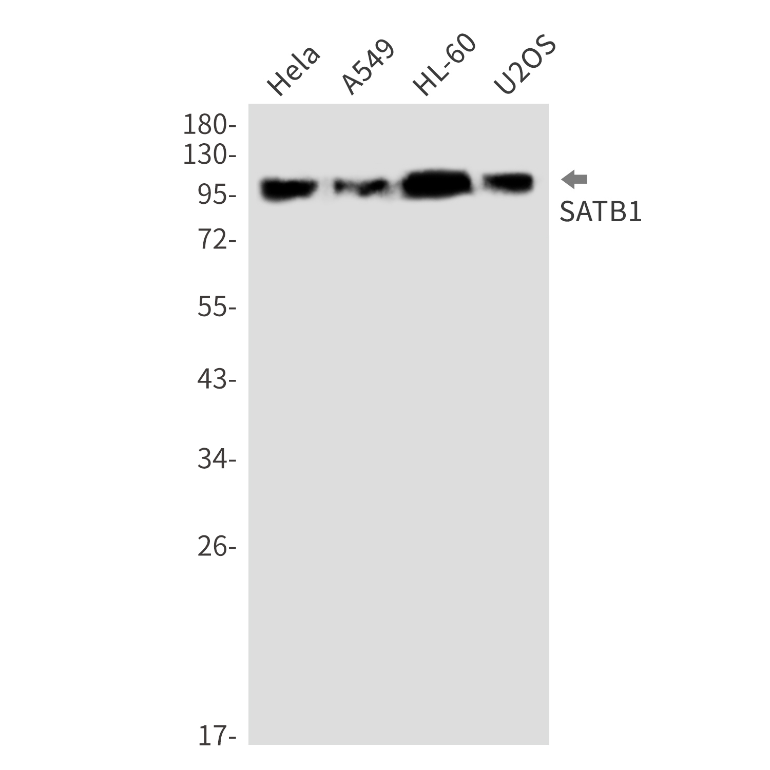 Western blot detection of SATB1 in Hela,A549,HL-60,U2OS cell lysates using SATB1 antibody(1:1000 diluted).