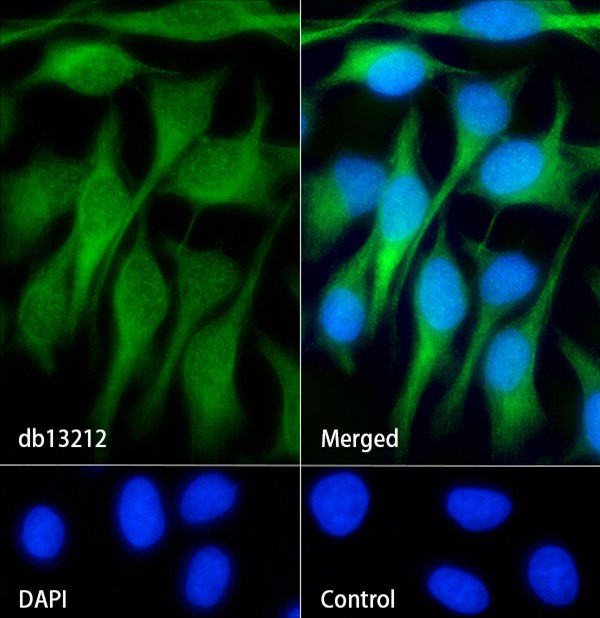 The cells were fixed with cold 100% methanol (10min, 4℃) and blocked in 1% BSA/10% normal goat serum/0.3M glycine in 0.1% PBS-Tween 20 for 1h. The cells were then incubate with db13212 (1:200) at room temprature for 1h, followed by a further incubation at room temperature for 45min with Goat Anti Rabbit lgG (H+L)-AF488 (