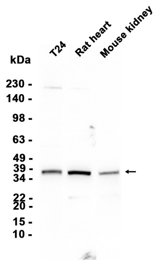 Western blot analysis of extracts from T24 cells and Mouse kidney,Rat heart tissue using db13213 at 1:1000.