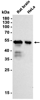 Western blot analysis of extracts from HeLa cells and Rat brain tissue using db13262 at 1:1000.
