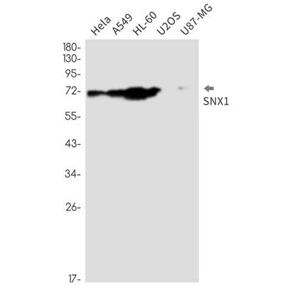 Western blot detection of SNX1 in Hela,A549,HL-60,U2OS,U87-MG cell lysates using SNX1 antibody(1:1000 diluted).