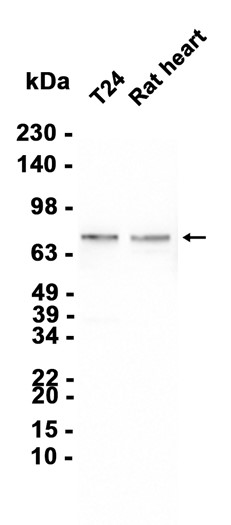 Western blot analysis of extracts from T24 cells and Rat heart tissue using db13297 at 1:5000.