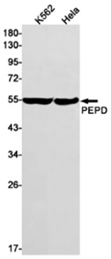 Western blot detection of PEPD in K562,Hela cell lysates using PEPD antibody(1:1000 diluted).