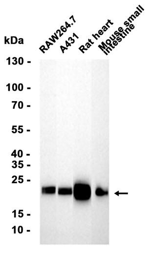 Western blot analysis of extracts from RAW264.7, A431 cells and Rat heart, Mouse small intestine tissues using db13351 at 1:1000.