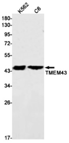 Western blot detection of TMEM43 in K562,C6 cell lysates using TMEM43 antibody(1:1000 diluted).
