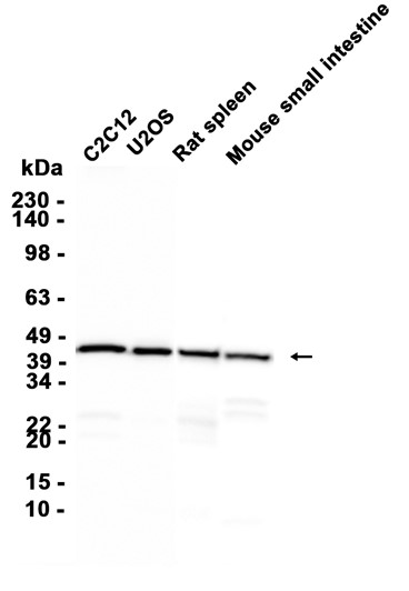 Western blot analysis of extracts from C2C12,U2OS cells and Rat spleen,Mouse small intestine tissue using db13353 at 1:3000.