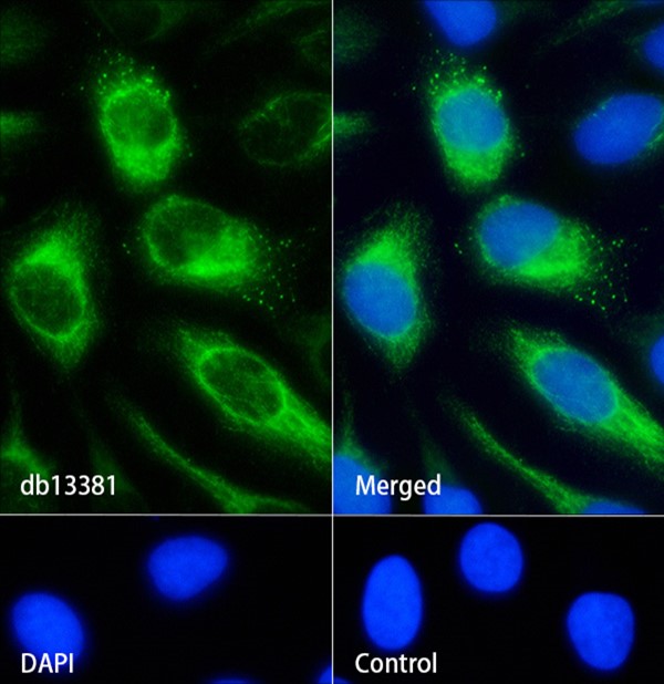 The cells were fixed with cold 100% methanol (10min, 4℃) and blocked in 1% BSA/10% normal goat serum/0.3M glycine in 0.1% PBS-Tween 20 for 1h. The cells were then incubate with db13381 (1:50) at room temprature for 1h, followed by a further incubation at room temperature for 45min with Goat Anti Rabbit lgG (H+L)-AF488 (