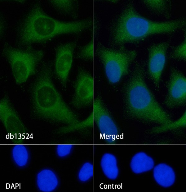 The cells were fixed with cold 100% methanol (10min, 4℃) and blocked in 1% BSA/10% normal goat serum/0.3M glycine in 0.1% PBS-Tween 20 for 1h. The cells were then incubate with db13524 (1:100) at room temprature for 1h, followed by a further incubation at room temperature for 45min with Goat Anti Rabbit lgG (H+L)-AF488 (