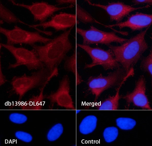 The cells were fixed with cold 100% methanol (10min, 4℃) and blocked in 1% BSA/10% normal goat serum/0.3M glycine in 0.1% PBS-Tween 20 for 1h. The cells were then incubate with db13986-DL647 (1:200,shown in red) at room temprature for 1h. Nuclear DNA was labeled in blue with DAPI.