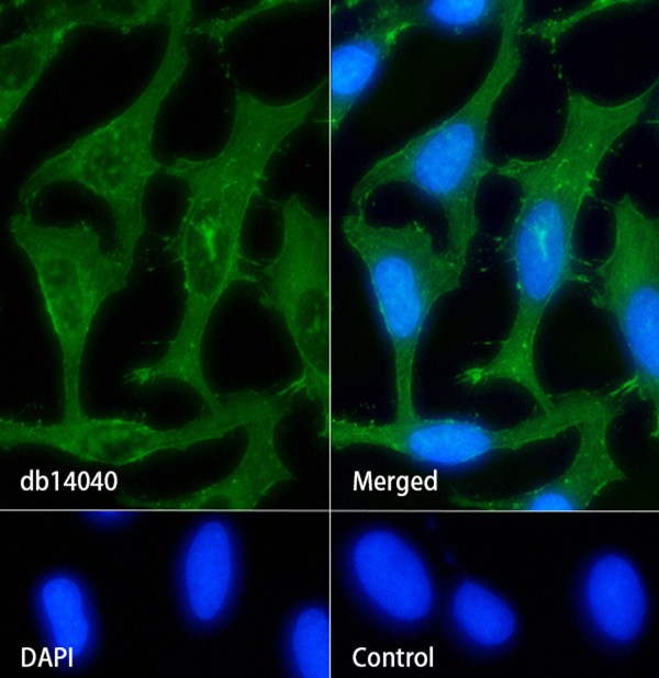 The cells were fixed with cold 100% methanol (10min, 4℃) and blocked in 1% BSA/10% normal goat serum/0.3M glycine in 0.1% PBS-Tween 20 for 1h. The cells were then incubate with db14040 (1:50) at room temprature for 1h, followed by a further incubation at room temperature for 45min with Goat Anti Rabbit lgG (H+L)-AF488 (