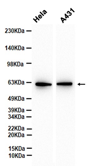 Western blot analysis of extracts from HeLa,A431 cells using db14100 at 1:3000.