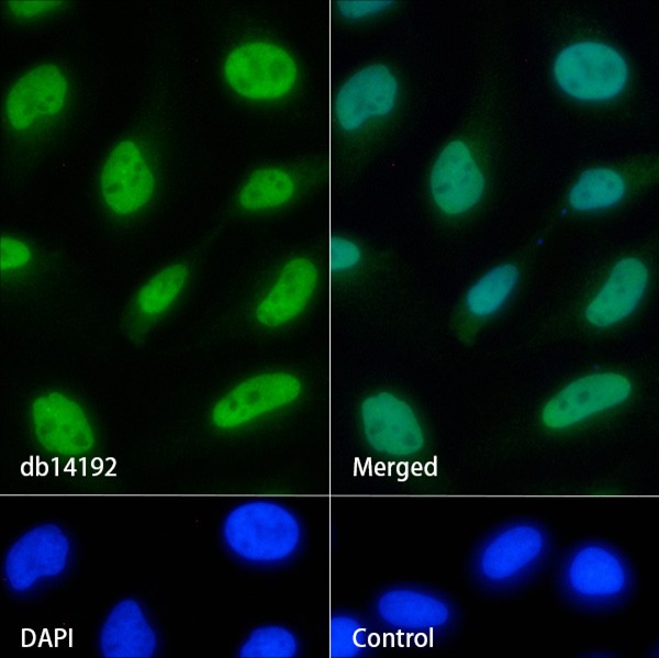 The cells were fixed with 4% PFA (10min, RT) followed by treatment with 0.1% Triton X-100 (10min, RT), and blocked in 1% BSA/10% normal goat serum/0.3M glycine in 0.1% PBS-Tween 20 for 1h. The cells were then incubate with db14192 (1:500) at room temprature for 1h, followed by a further incubation at room temperature for 45min with Goat Anti Rabbit lgG (H+L)-AF488 (