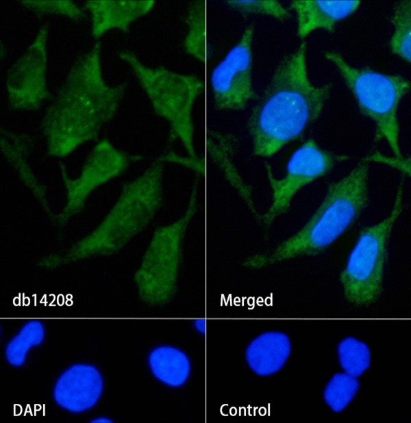 The cells were fixed with cold 100% methanol (10min, 4℃) and blocked in 1% BSA/10% normal goat serum/0.3M glycine in 0.1% PBS-Tween 20 for 1h. The cells were then incubate with db14208 (1:50) at room temprature for 1h, followed by a further incubation at room temperature for 45min with Goat Anti Rabbit lgG (H+L)-AF488 (