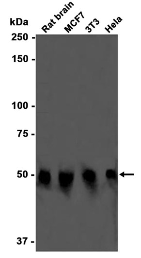 Western blot analysis of extracts from MCF-7, 3T3, HeLa cells and Rat brain tissue using db14208 at 1:1000.