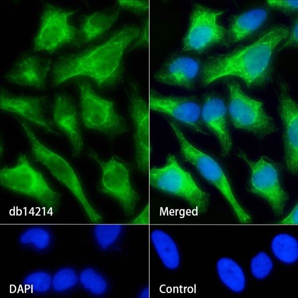 The cells were fixed with 4% PFA (10min, RT) followed by treatment with 0.1% Triton X-100 (10min, RT), and blocked in 1% BSA/10% normal goat serum/0.3M glycine in 0.1% PBS-Tween 20 for 1h. The cells were then incubate with db14214 (1:100) at room temprature for 1h, followed by a further incubation at room temperature for 45min with Goat Anti Rabbit lgG (H+L)-AF488 (