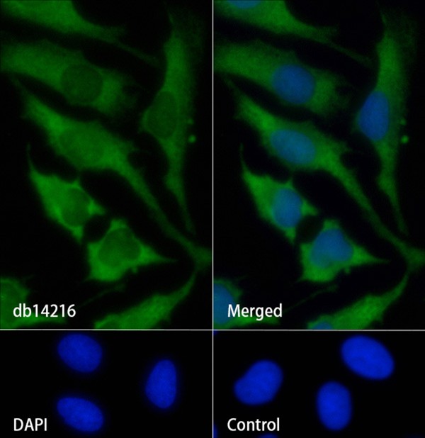 The cells were fixed with cold 100% methanol (10min, 4℃) and blocked in 1% BSA/10% normal goat serum/0.3M glycine in 0.1% PBS-Tween 20 for 1h. The cells were then incubate with db14216 (1:50) at room temprature for 1h, followed by a further incubation at room temperature for 45min with Goat Anti Rabbit lgG (H+L)-AF488 (