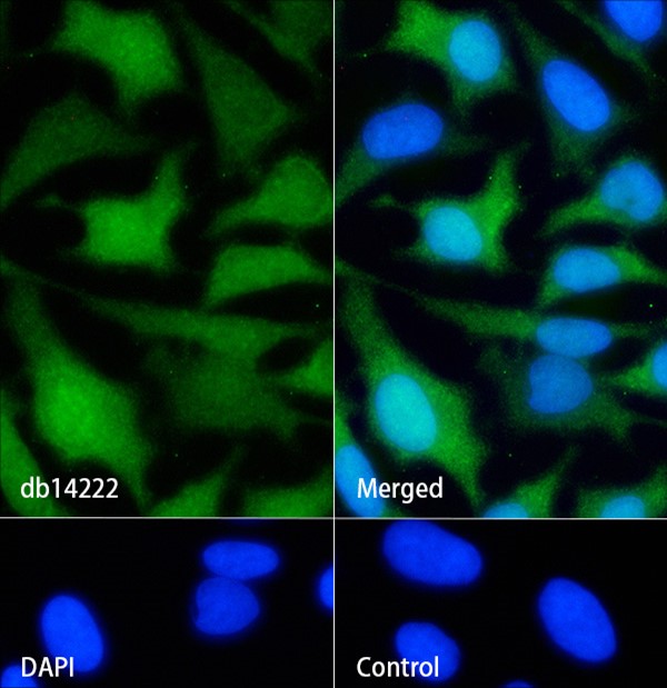 The cells were fixed with cold 100% methanol (10min, 4℃) and blocked in 1% BSA/10% normal goat serum/0.3M glycine in 0.1% PBS-Tween 20 for 1h. The cells were then incubate with db14222 (1:200) at room temprature for 1h, followed by a further incubation at room temperature for 45min with Goat Anti Rabbit lgG (H+L)-AF488 (