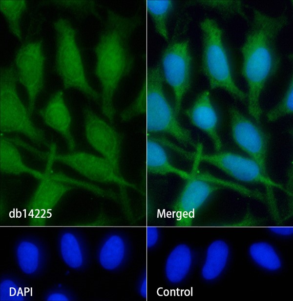 The cells were fixed with cold 100% methanol (10min, 4℃) and blocked in 1% BSA/10% normal goat serum/0.3M glycine in 0.1% PBS-Tween 20 for 1h. The cells were then incubate with db14225 (1:500) at room temprature for 1h, followed by a further incubation at room temperature for 45min with Goat Anti Rabbit lgG (H+L)-AF488 (