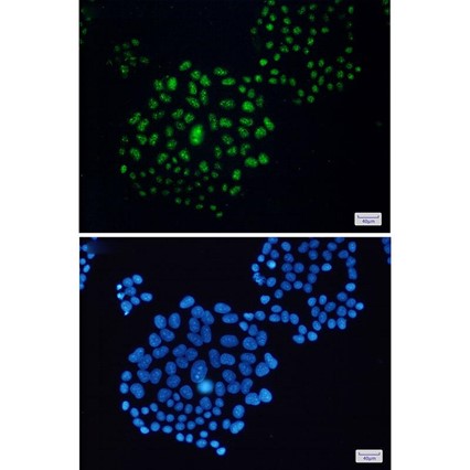 Immunofluorescent analysis of HeLa cells using db14236 antibody (green), and DAPI (blue).
