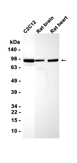 Western blot analysis of extracts from C2C12 cells and Rat kidney,Rat heart tissue using db14236 at 1:6000.