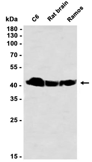 Western blot analysis of extracts from C6, Ramos cells and Rat brain tissue using