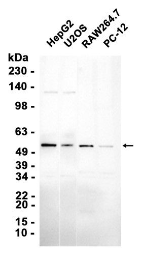 Western blot analysis of extracts from HepG2,U2OS,RAW264.7,PC-12 cells using db14377 at 1:1000.