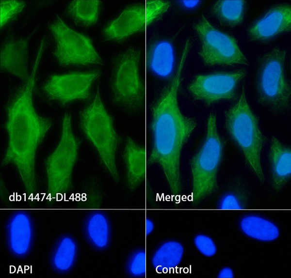 The cells were fixed with 4% PFA (10min, RT) followed by treatment with 0.1% Triton X-100 (10min, RT), and blocked in 1% BSA/10% normal goat serum/0.3M glycine in 0.1% PBS-Tween 20 for 1h. The cells were then incubate with db14474-DL488 (1:100, shown in green). Nuclear DNA was labeled in blue with DAPI.