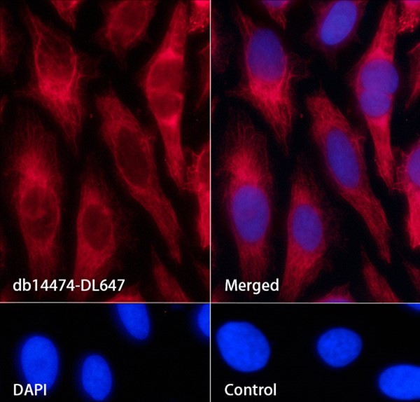 The cells were fixed with cold 100% methanol (10min, 4℃) and blocked in 1% BSA/10% normal goat serum/0.3M glycine in 0.1% PBS-Tween 20 for 1h. The cells were then incubate with db14474-DL647 (1:200,shown in red) at room temprature for 1h. Nuclear DNA was labeled in blue with DAPI.