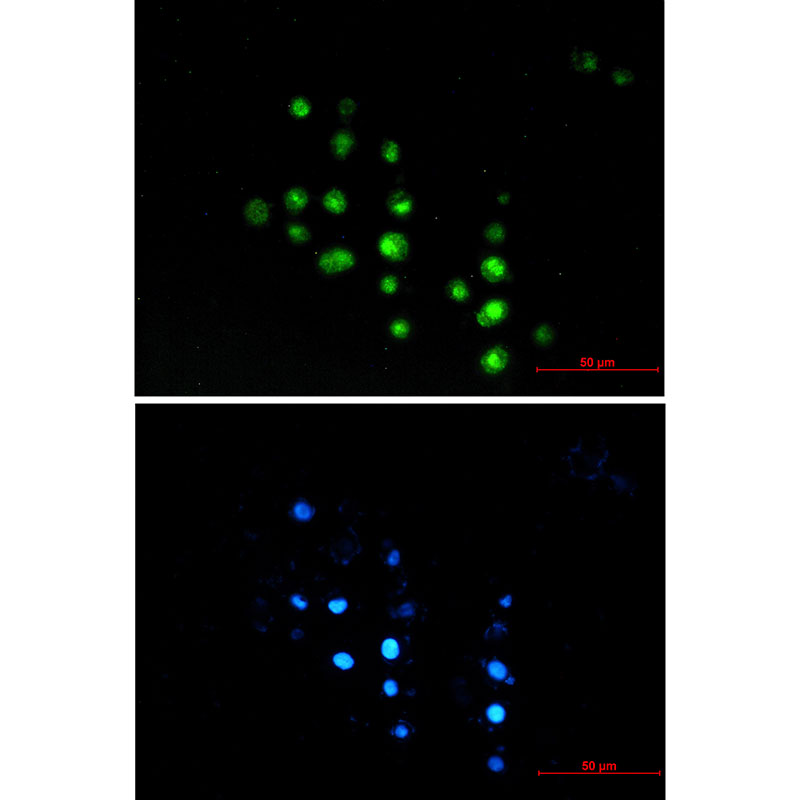Immunofluorescent analysis of MCF-7 cells using db14478 antibody (green), and DAPI (blue).