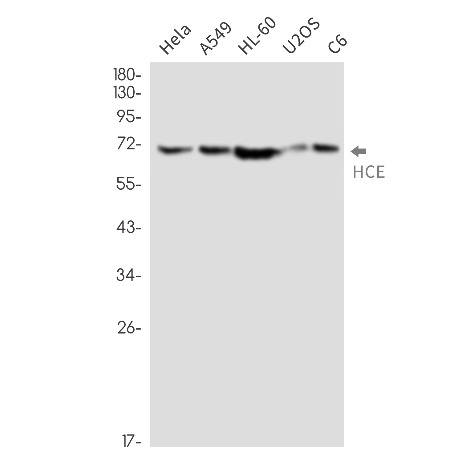 Western blot detection of HCE in Hela,A549,HL-60,U2OS,C6 cell lysates using HCE antibody(1:1000 diluted).