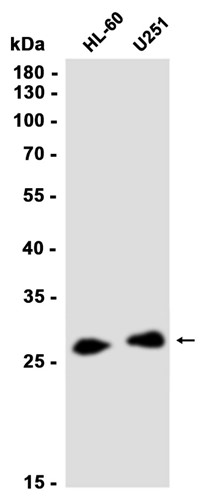 Western blot analysis of extracts from HL-60, U251 cells using db14479 at 1:1000.